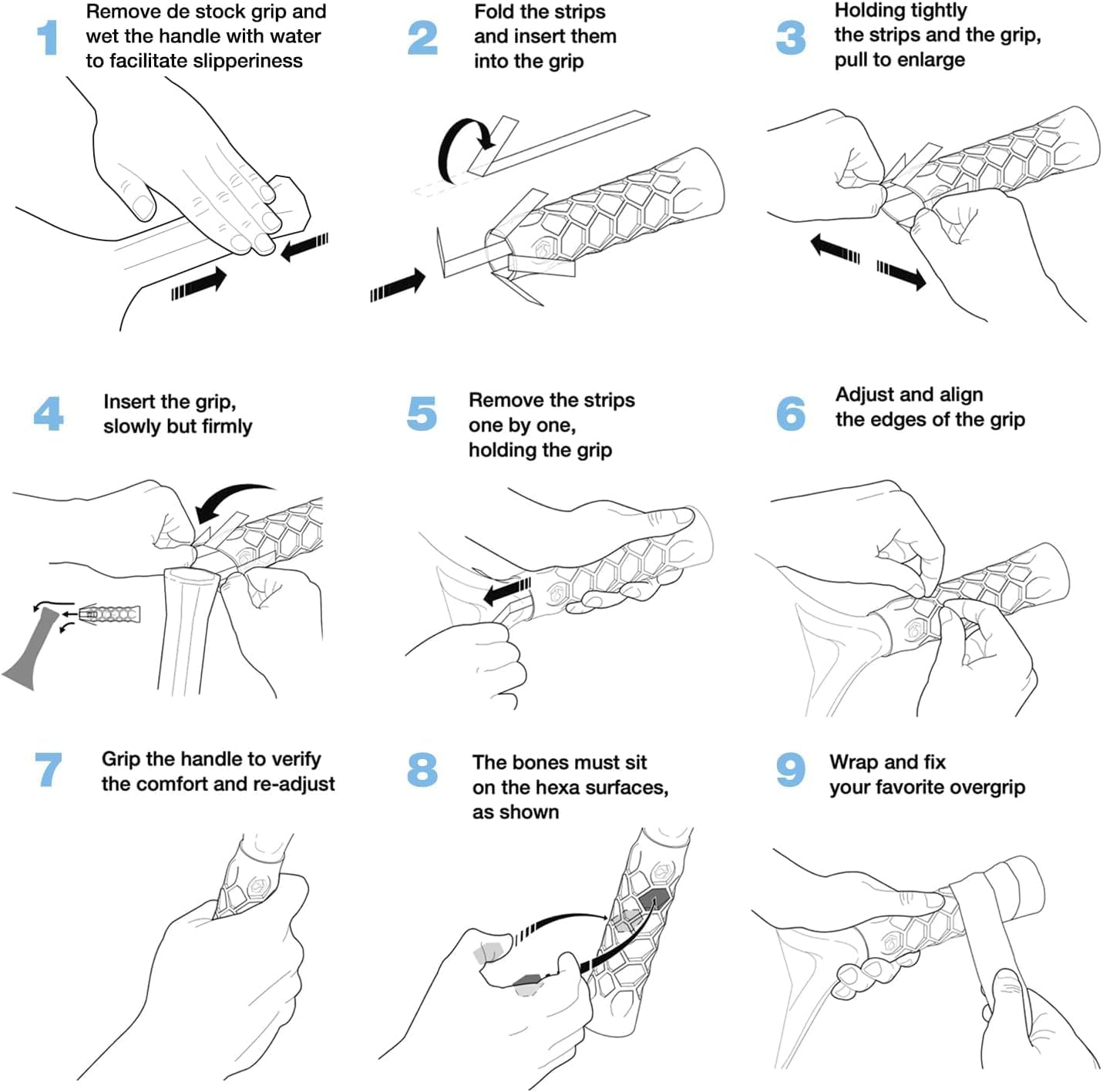 Grip innovador con forma de paneles que se adapta al mango de la pala.